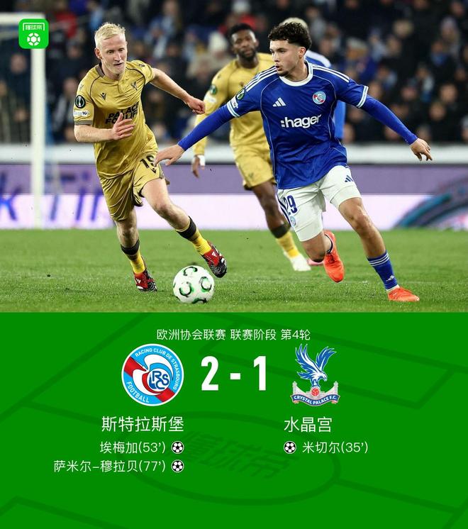 北京时间11月28日,欧协联赛第四轮,斯特拉斯堡主场迎战水晶宫。比赛中,米切尔在马塔塔的助攻下率先进球,帮助水晶宫取得领先。随后,埃梅加在迭戈·莫雷拉的助攻下扳平比分。萨米尔·阿尔·穆拉贝在比赛下半场攻入致胜一球。最终,斯特拉斯堡2-1击败水晶宫。决战第35分钟,米切尔禁区左侧低射破门。水晶宫1-0斯特拉斯堡。第53分钟,埃梅加禁区后破门。斯特拉斯堡1-1水晶宫。第77分钟,穆拉贝禁区内再次射门破门。第8分钟,斯特拉斯堡2-1战胜水晶宫。第8分钟,马塔射门高出,门将将球没收。第14分钟,那无禁区左侧低射破门。球没有击中门柱。第30分钟,埃梅加内线头球破门e区。 ,球因干扰而失败。第35分钟,米切尔禁区左侧低射破门。水晶宫1-0斯特拉斯堡。第37分钟,斯特拉斯堡门将出现失误。萨尔推射空门柱。第53分钟,埃梅加禁区前沿射门。斯特拉斯堡凭借最后时刻的射门1-1水晶宫。第61分钟,沃尔顿禁区外抽射空门,皮球击中横梁。第77分钟,穆拉贝禁区内补射破门。斯特拉斯堡2-1战胜水晶宫。球队阵容技术统计