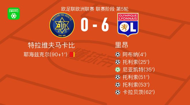 北京时间11月28日,欧国联第五轮比赛,特拉维夫马卡比主场迎战里昂。比赛开始后不久,阿布纳就取得了领先,让他的球队取得了领先。阿布纳也提供助攻,托利索也帮助扩大比分。第35分钟,尼亚卡托主罚点球进一步扩大领先优势。与不同球队的复赛中,舒尔茨连续送出两次助攻,托利索梅开二度上演帽子戏法。第62分钟,哈里斯·麦拉舍尔助攻卡拉维茨进球,进一步将比分提高。下半场补时阶段,特拉维夫马卡比队的耶赫伊兹克尔两张黄牌被罚下场。全场比赛结束,特拉维夫马卡比0-6不敌里昂。伟大时刻 比赛开始四分钟,里昂队的阿布纳进球。第25分钟,里昂队阿布纳助攻托利索进球。第35分钟,里昂的尼亚卡特主罚点球。第51分钟,里昂的舒尔茨助攻托利索进球。第53分钟,里昂队乌尔兹助攻托利索进球。第62分钟,里昂球员哈里斯·迈拉舍助攻卡拉贝茨破门。下半场补时一分钟,特拉维夫马卡比队的耶赫兹卡尔领到第二张黄牌。球队阵容技术统计