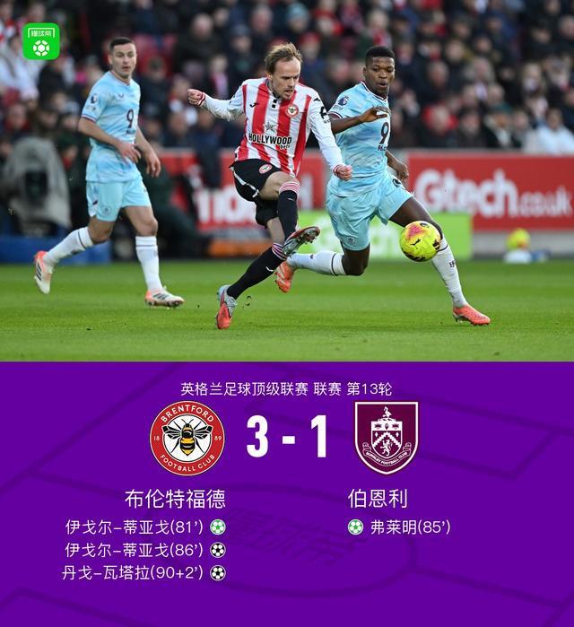 北京时间11月29日,英超第13轮比赛,布伦特福德主场迎战伯恩利。比赛中,布伦特福德凭借蒂亚戈的点球取得领先。随后伯恩利通过弗莱明点球扳平比分。不久之后,蒂亚戈再次进球,主队重新取得领先。比赛进入补时阶段,亨德森助攻,丹戈·瓦塔拉冷静推射锁定胜局。最终布伦特福德3-1击败伯恩利。这场重要赛事第81分钟,图安泽贝进球,伊戈尔·蒂亚戈将球撞倒,布伦特福德1-0获胜。第84分钟,卡约德失误得一分,弗莱明任意球破门,1-1。第86分钟,蒂亚戈梅开二度,布伦特福德2-1。丹戈·瓦塔拉在第90分钟和第2分钟的进球帮助布伦特福德3-1获胜。第14分钟,两队球员登场,战斗一触即发。内森·柯林斯 (Nathan Collins) 试图头球攻门,但球刚刚越过门柱。第21分钟,达姆苏高突破破门破门。球越过了横梁。第34分钟,图安泽贝尝试近距离射门,但皮球被挡住。第49分钟,丹戈·瓦塔拉被判越位,伊戈尔·蒂亚戈进球被判无效。第64分钟,布伦特福德球员抱怨手球,但裁判没有判罚点球。技术统计【英超只见咪咕】