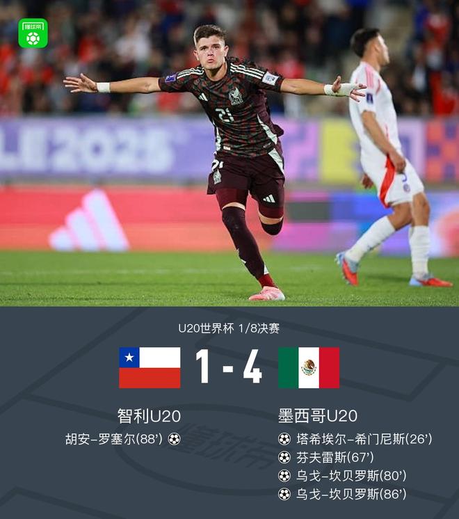 1/8 U20世界杯决赛中,智利U20与墨西哥U20激战。比赛初期,墨西哥U20率先打破平衡。塔希尔·希门尼斯在吉尔伯托·莫拉的助攻下进球。两人随后攻防交锋。墨西哥U20下半场表现不佳。埃利亚斯·蒙蒂尔送出助攻,芬弗雷斯进球扩大领先优势。随后阿毛里·莫拉莱斯两次重要传球,乌戈·坎贝罗斯连续拿下两分扩大比分。全场比赛结束,智利U20在胡安·拉塞尔的射门和劳塔罗·米利安的助攻下拿下一分。最终,比赛结束,智利U20 1-4 墨西哥U20。重要比赛第26分钟,莫拉助攻,希门尼斯推射破门打破场上平衡,打破了墨西哥1-0的平衡。第67分钟,埃利亚斯蒙蒂尔助攻,芬弗雷斯头球顶射破门。 80强赛墨西哥2-0智利第分钟,莫拉莱斯助攻,坎贝罗斯推射破门再次获胜。墨西哥3-0。第86分钟,坎贝罗斯再进一球,完成双环。墨西哥4-0。劳塔罗·米利安在第88分钟助攻。拉塞尔的进球帮助智利队1-4领先。两队球员都很快进入了比赛。第9分钟,迭戈·桑切斯右路低传,尼古拉斯·苏亚雷斯解围。第10分钟,阿列克谢·多明戈斯左侧突破底线,无角度射门击中边网。第18分钟,他在角球处射门。米洛万·塞利斯的头球稍稍偏离目标。第26分钟,希门尼斯接莫拉助攻推射破门,打破平衡。墨西哥亨亨 第41分钟1-0,获得禁区外任意球。芬弗雷斯射门,但被防守球员挡出。第48分钟,米利亚射门,皮球击中迭戈·奥乔亚。 Var审查显示该球不是球。我半场反击第57分钟,米利安传中,拉塞尔追击,但射门失败。第61分钟,胡安·拉塞尔右路插上射门,但门将丢球。第67分钟,埃利亚斯·蒙蒂尔助攻,芬·弗雷斯弧顶破门,墨西哥2-0智利。第72分钟,马尔坎特任意球直接打在门背上,门将单手将球扑在横梁上。第80分钟,坎贝罗斯在莫拉莱斯助攻下推射破门,再次获胜。墨西哥3-0。第86分钟,坎贝罗斯再进一球,两分球破门,墨西哥4-0。第88分钟,拉塞尔接劳塔罗·米利安助攻破门,取得一分。智利1-4球队阵容技术统计