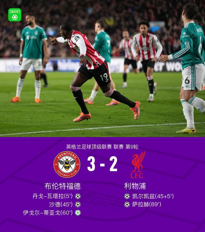 北京时间10月26日,英超联赛第九轮开始。布伦特福德主场迎战利物浦。瓦塔拉上半场高射破门。维尔茨中路射门,出界。沙德一脚射门首开纪录。凯尔·凯茨从中路射门得分。蒂亚戈在下半场主罚点球破门。瓦塔拉多次制造威胁,萨拉赫也能漂亮得分。最终,布伦特福德在比赛最后时刻以3-2击败利物浦。关键赛事第5分钟,手榴弹战术,瓦塔拉半抽射勾手破门,布伦特福德1-0利物浦。第45分钟,沙德低射破门,布伦特福德2-0战胜利物浦。第45分钟凯尔·凯茨中路破门+5,利物浦第60分钟1-2。范迪克因在禁区线上犯规而获得点球。蒂亚戈主罚点球。利物浦1-3落后。第88分钟,萨拉赫停球。左脚接球,右脚抽射。利物浦2-3布伦特福德。第5分钟,发生枪击事件。第19分钟,瓦塔拉钩半抽射破门。布伦特福德1-0利物浦。第19分钟,埃基蒂奇后脚跟换线。维尔茨从中路射门,但偏出了门柱。第21分钟,埃基蒂奇尝试头球攻门,但皮球高出球门。第24分钟,加克浦被罚下场。第27分钟,凯尔·凯茨左路送出传球,但球被门将抢断。第32分钟,亨德森禁区外射门,但皮球偏出。第38分钟,瓦塔拉禁区外远射,但皮球偏出。第39分钟,达姆高禁区外射门,但被马马达什维利挡出。第41分钟,琼斯禁区外远射,凯莱赫将球没收。第45分钟,沙德低射破门,布伦特福德2-0获胜利物浦的故事。进球前45分钟,加克波在禁区内被放倒。裁判:第45分钟和第5分钟没有判罚。凯尔·凯茨中路破门,利物浦1-2领先。第46分钟裁判受伤,法律暂停。第四名官员被替换以执行该决定。第53分钟,沙德传球。蒂亚戈将球射入禁区,但射门被门将挡出。 6:00:范迪克因在禁区线上犯规而受到处罚。蒂亚戈主罚点球。利物浦1-3落后。第65分钟,瓦塔拉禁区内头球破门。第88分钟,萨拉赫左脚停球,右脚抽射破门。利物浦2-3布伦特福德。第90分钟和第2分钟,范戴克头球攻入禁区时,有人怀疑他肘击了蒂亚戈。裁判没有对技术统计进行评判【只看英超联赛米格】